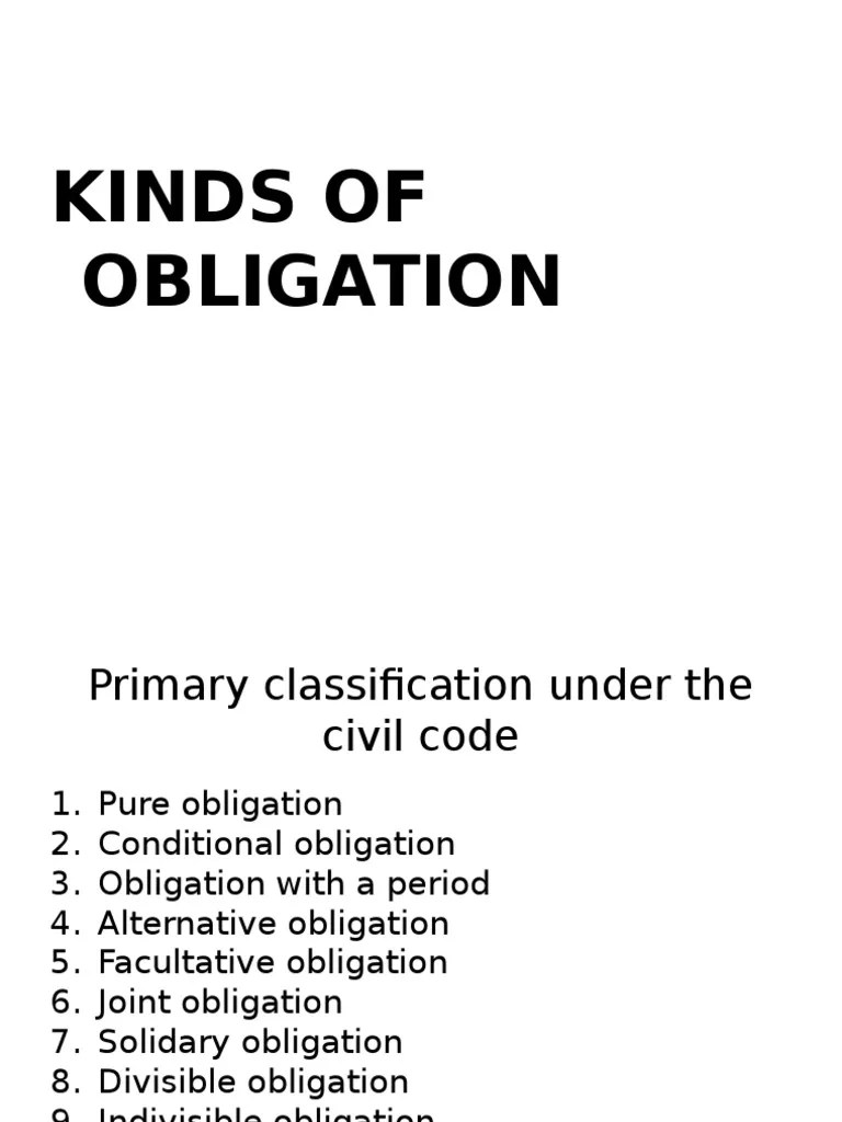 Different kinds of obligations by princes joy r. Seller would no mind be inner the obligation to sell at the agreed conditions. A pure obligation is one that is demandable at once because it does not depend upon a future or uncertain event, not on a past event unknown to the parties and is not an obligation with a resolutory condition. Media productions limited orders a new printing line incl. (2) obligations which have for their object the accomplishment of work by metrical units (par.